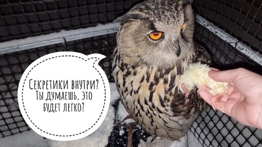 Сова Ёль троллит меня своим цыплёнком. Домовый сыч Лучик переживает за мохноногого сыча Чучундрия