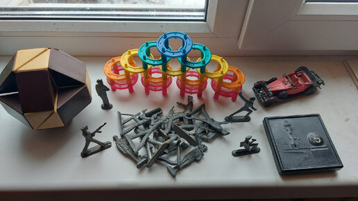 По чердакам собирал советские игрушки. Здесь головоломки, солдатики, пирамида и машинка. Показываю, сколько такой винтаж стоит на аукционах