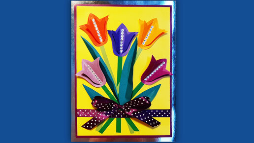 Тюльпаны из бумаги аппликация. Как сделать открытку из цветной бумаги. Подарок своими руками. Шаблон. Поделка в садик или школу.