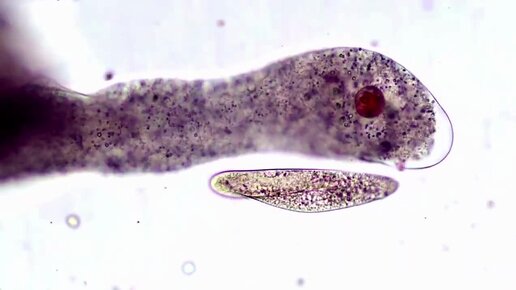 Амёба поедает инфузорию туфельку