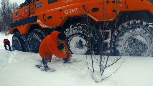 Вездеход «Русак» застрял в свежем снегу на реке Малой Хараматолоу, Полярный Урал, Ямал