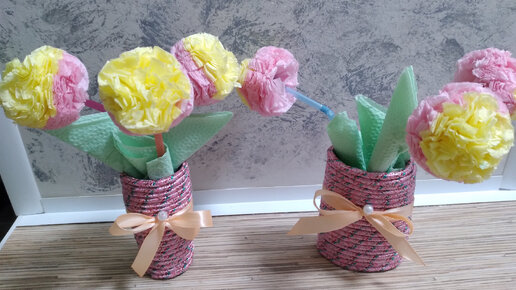 Цветы из салфеток в вазочках.Школьные подарки к женскому празднику