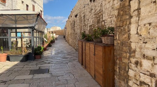 Италия. Улица с ресторанами за крепостной стеной старого города. Джовинаццо