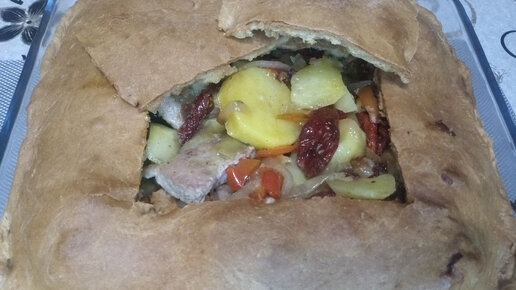 Мясо с овощами запечённое в тесте на кефире.