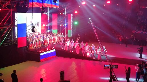 Мероприятие во Дворце Спорта им. В. Высоцкого. Песня [Две сестры - Беларусь и Россия] начало соревнований.