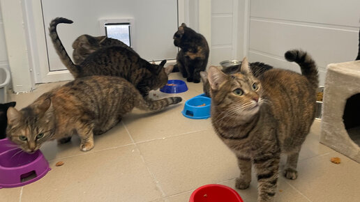 Воскресенье: обед у кошек в новом приюте 😻 Танцуют, а точнее бодро угощаются влажным кормом все!🤗