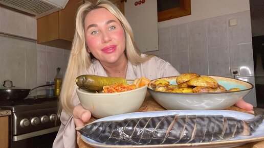 Мукбанг/Скумбрия с картошкой и солеными огурцами