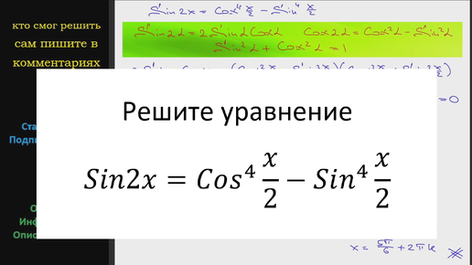Математика Решите уравнение Sin2x=(Cosx/2)^4 -(Sinx/2)^4