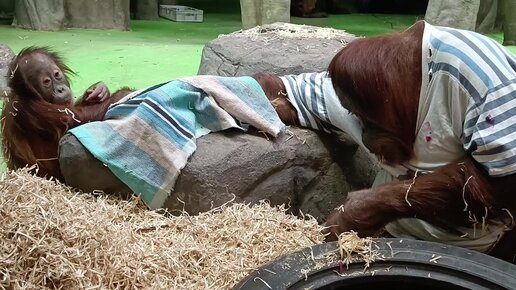 Орангутаны дочка Алиса и мама Чави в футболке в Московском зоопарке.