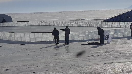 Рекламщики спорят,как лучше ставить флажки вокруг хоккейной площадки.Скоро хоккейный матч с именитыми хоккеистами.(Иркутск.Б.Голоустное.7.03