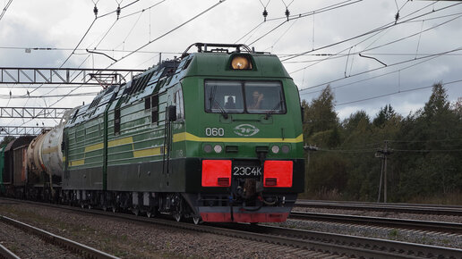 Встреча грузовых поездов под электровозами ВЛ10У-947 и 2ЭС4К-060. Станция Большой Двор Октябрьской железной дороги. Октябрь 2018 года.