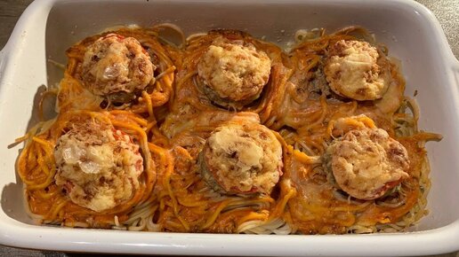 Гнезда из спагетти с фаршем, помидорами и сыром в духовке. Приготовила в честь праздника для своей семьи