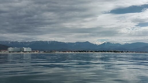 ФТ Сириус, каякинг в Имеретинской бухте, начало марта 2023, панорама моря, пляжей, гор и Олимпийского парка с расстояния 1,5 км. от берега.