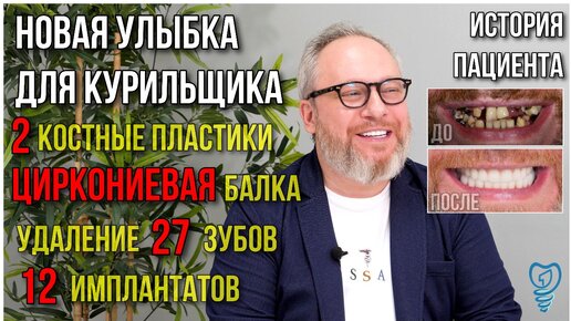 История пациента. Удалили 27 зубов. Циркониевая балка. Новая улыбка для курильщика.