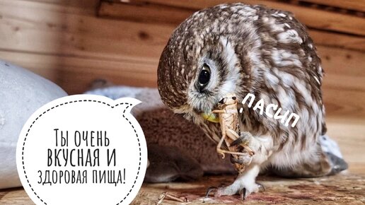 Маленькая сова хрустит саранчовыми чипсиками. Вкусное!