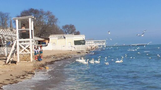 Набережная Евпатории. Лебеди на пляже. Крым, март 2023.
