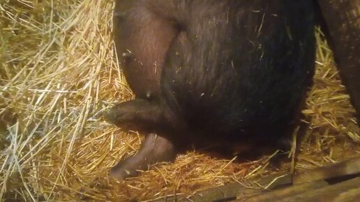 Рожает въетнамская вислобрюхая свинка. Поросёнок задом идёт