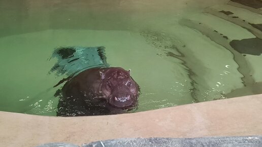 Бегемот Ксюша плавает в бассейне в Московском зоопарке.