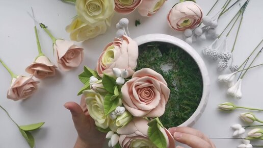 Собираю композицию из цветов ручной работы роз и ранункулюсов на подарок бабушке. Цветы из самозастывающей глины