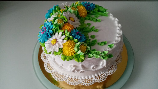 Торт с полевыми цветами. Украшение белково-заварным кремом.