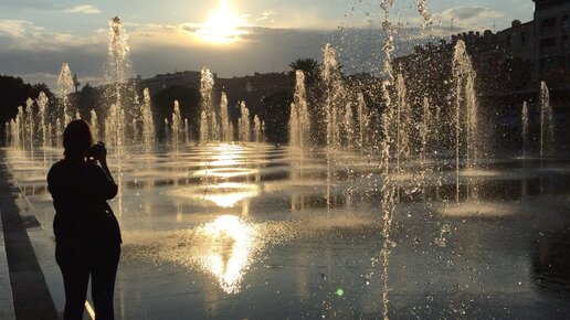 Ницца. Работающие фонтаны в парке Променад дю Пайон в лучах заходящего солнца. Мы с женой наслаждались этой сказочной красотой весной 2017 г