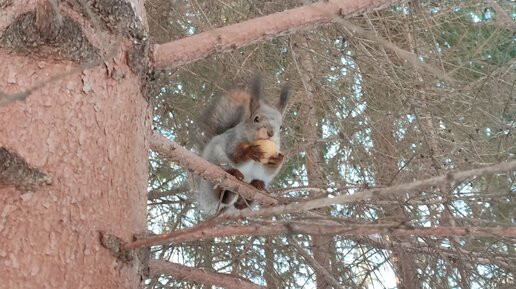 Белка ест грецкий орех из скорлупки