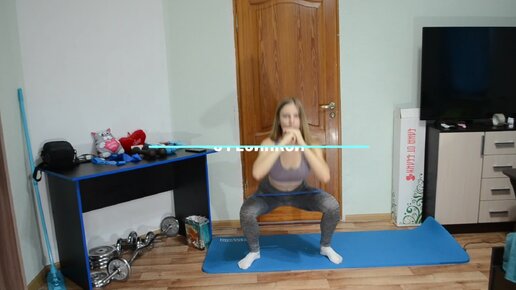 Приседания с резинкой, советую делать 4 подхода по 15-20 раз