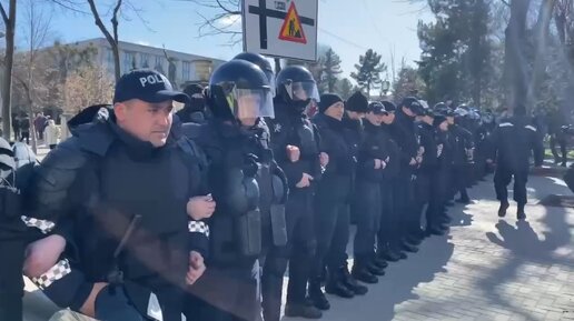 Сотрудники спецназа полиции в Кишиневе выстраиваются в дополнительные кордоны в ожидании подхода участников акции оппозиции.