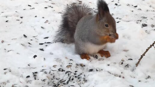 Орешек вкуснее! Белочка бегает по свежему снегу и семечки собирает! Санкт-Петербург.