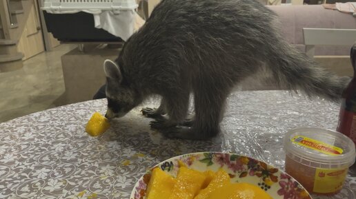Долли размазюкала манго по столу 😂 #енот #домашнийенот #приколысживотными