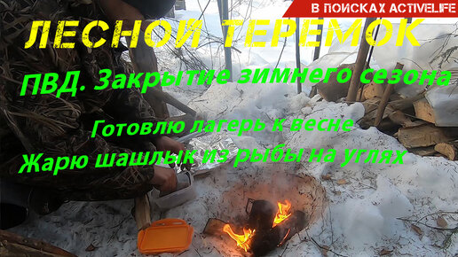 Поход выходного дня к ЛЕСНОМУ ТЕРЕМКУ и закрытие зимнего сезона 2023. Готовлю лагерь к весне. Разбираю печку. Жарю шашлык из рыбы на углях
