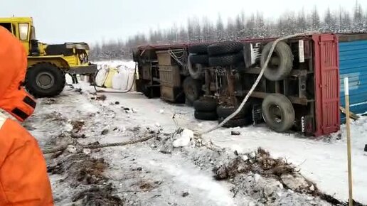 В Якутии на бок упал многотонный прицеп с контейнерами. Чтобы его поднять, понадобилось два трактора