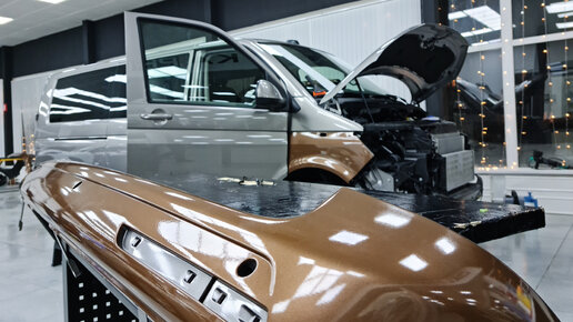 Оклеили нижнюю часть Volkswagen Caravelle в коричневый винил, защитили перед в глянцевый полиуретан