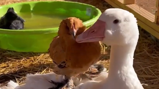 Гусыня взяла опеку над цыплятами и заботливо охраняет их