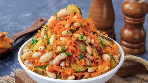 Постное блюдо, которое легко утолит голод. Салат с фасолью, солеными огурцами и морковью.