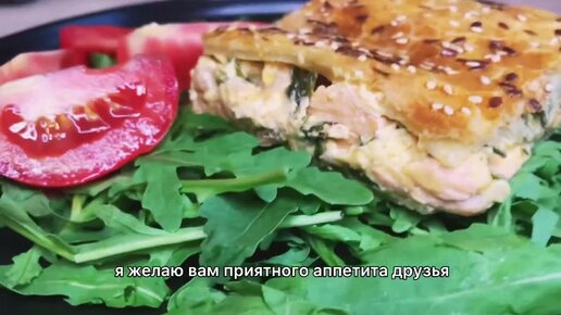 ПИРОГ ИЗ СЛОЁНОГО ТЕСТА С ГОРБУШЕЙ, ЗЕЛЁНЫМ ЛУКОМ И СЫРОМ.