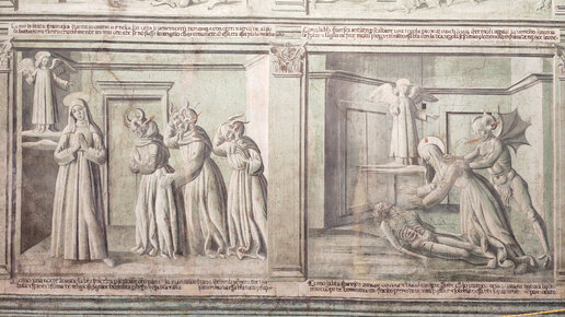 Показываю комнату, в которой жила Франческа Римская, и необычные для Рима монохромные фрески с искушениями этой святой...