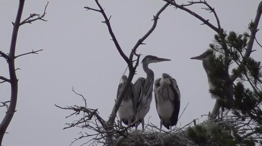 Птенцы цапли учатся летать