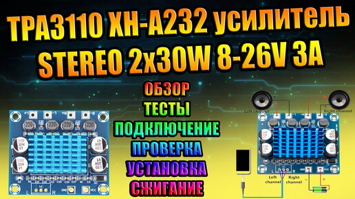STEREO AMP 2x30W TPA3110 XH-A232 стерео усилитель D-class 2 канала по 30Вт проверка обзор тесты DIYДобро пожаловать на канал GARAGE-28.
