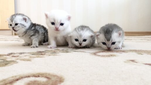 Котятам кошки Кайли 18 дней. Первая групповая прогулка по ковру. Котята орут, мама рядом в родильном домике, кормит 2 белых котят.