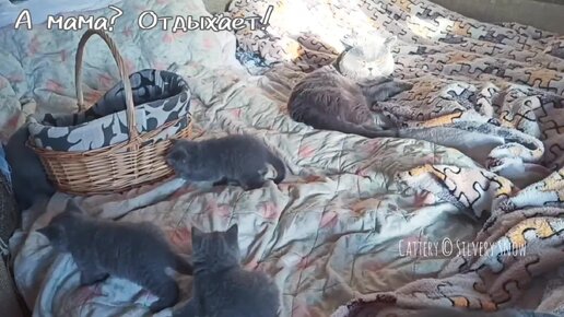 Пока мама кошка отдыхает, папа кот следит за безопасностью детей.