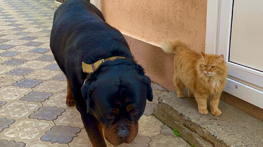 Ротвейлер любит рыжего кота с которым он вырос
