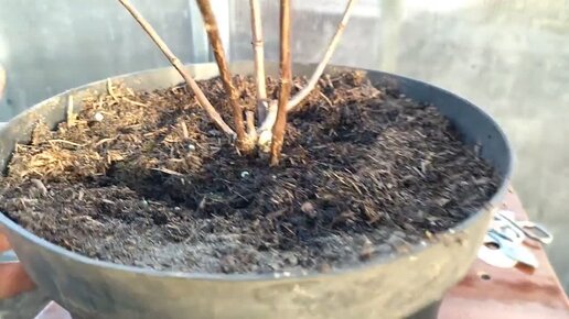 Покупная гортензия в горшке оказалась заглубленной. Чтобы грамотно обрезать такой саженец, сначала исправляю ошибки при посадке