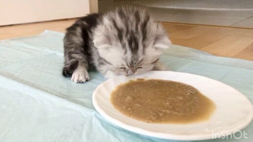 Малышка первый раз самостоятельно пробует и ест полноценный прикорм для 3-х недельных котят. Котёнок кошки Кайли в возрасте 20 дней.