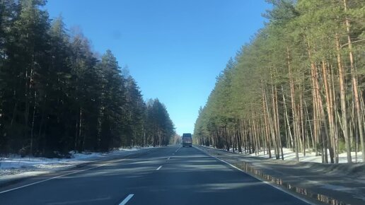 Длинная дорога через весенний лес в хорошую солнечную погоду. Едем по бетонке во Владимирской области.