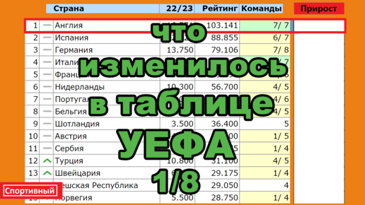Таблица коэффициентов УЕФА. Прирост недели после 18 Лиги Чемпионов.