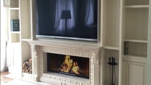 Самый лучший встроенный камин для дома - классический мраморный портал с дровяной топкой в законченном интерьере, да еще и с телевизором