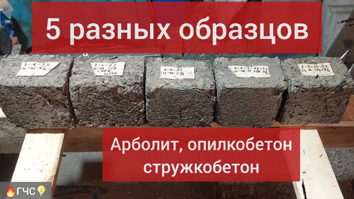 5 разных экспериментальных образцов. Арболит, опилкобетон, стружкобетон, деревобетон. Сульфат аллюминия, жидкое стекло.