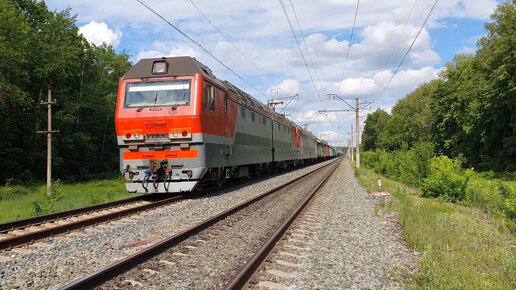 Тишину и пение птиц нарушает звук приближающего грузового поезда, 2ЭС6-579+600 с поездом на запад