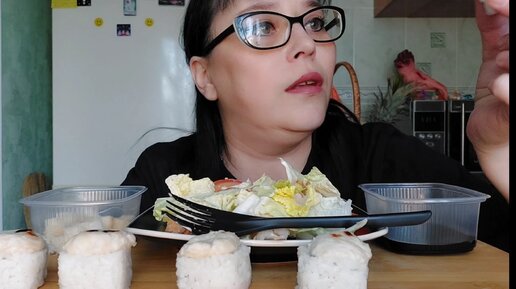 Мукбанг | Салат Цезарь и запеченые роллы. Не навязывайте своё. Обжорчик